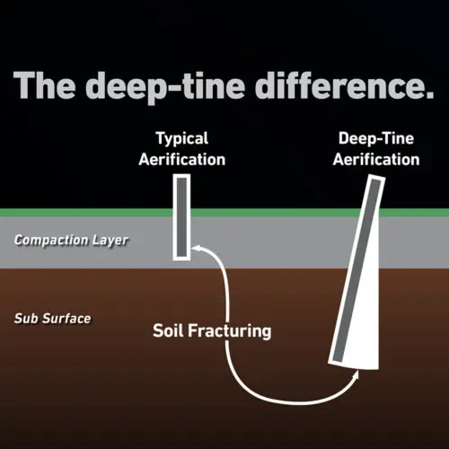 This compact, lightweight Procore SR54 machine can aerify to depths of up to 10 inches (250 mm), leaving a smooth playing surface. The SR54 produces a “soft touch” and is the ideal machine for aerating at a deep level, quickly and efficiently. Deep-tine aerification relieves soil compaction at lower soil levels than typical aerification. The tines fracture the soil creating channels through the root zone allowing oxygen, water and critical nutrients to penetrate deep into the soil profile.
