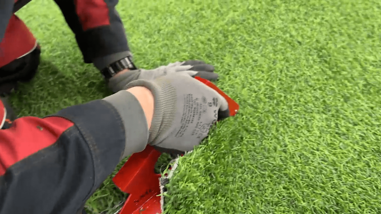 For proper cutting alongside of existing track seams of artificial turf.